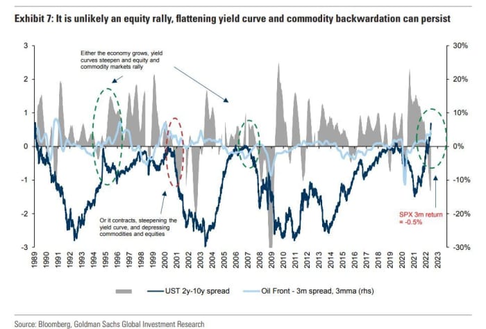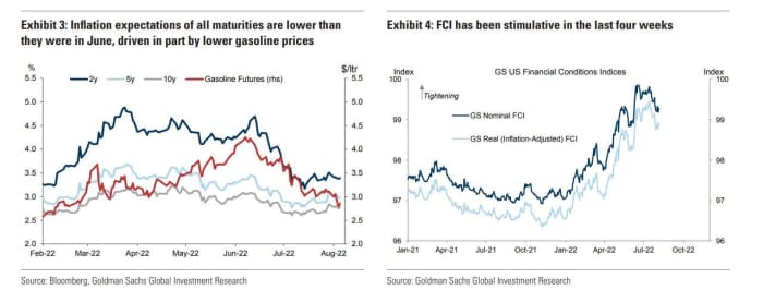 “In our view, macro markets are pricing an unsustainable contradiction — it is difficult to square a softening [financial conditions index], a more accommodative Fed pivot, falling inflation expectations and drawing commodity inventories,” said the Goldman team.